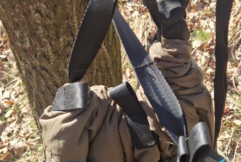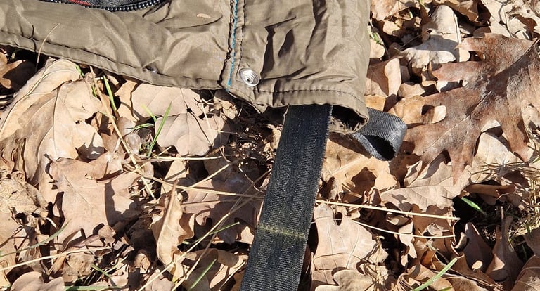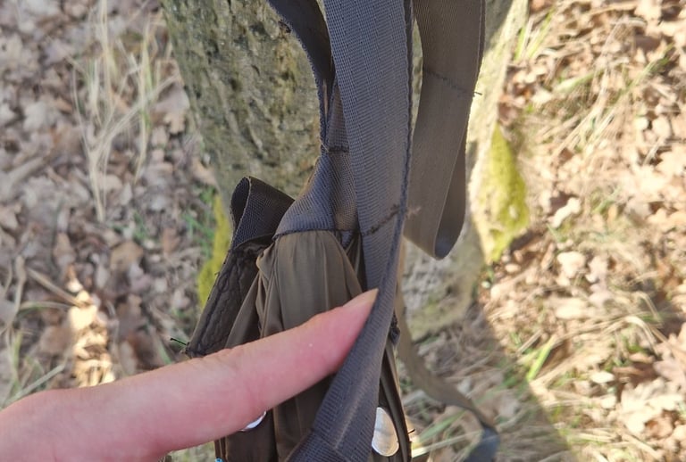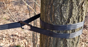 Rozłóż konstrukcję na ziemi. Złap za luźny pasek wychodzący z tunelu i przewlecz go przez oczko wychodzące z drugiej strony tego samego tunelu. Zaciągnij pasek, a następnie zapnij pas, owijając go dwa razy wokół pnia. Powtórz czynność po drugiej stronie konstrukcji.