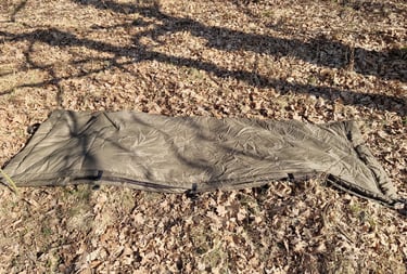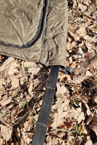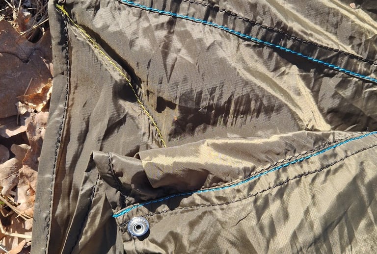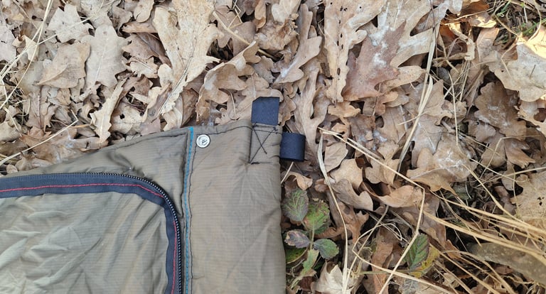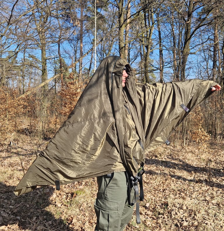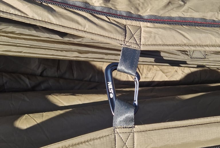 Rozłóż konstrukcję na ziemi. Złap za luźny pasek wychodzący z tunelu i przewlecz go przez oczko wychodzące z drugiej strony tego samego tunelu, tak aby zacieśnił się on na wiszącym pasie hamaka. Następnie zapnij pas o karabińczyk wiszącego hamaka. Powtórz czynność po drugiej stronie konstrukcji. Pozostałymi karabińczykami zepnij oczka dłuższych krawędzi tak, aby podpinka opatuliła hamak.