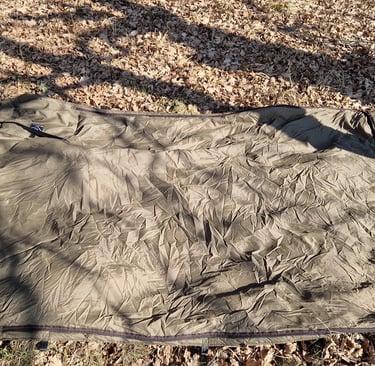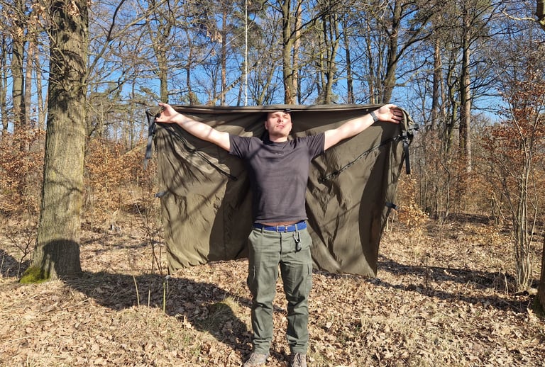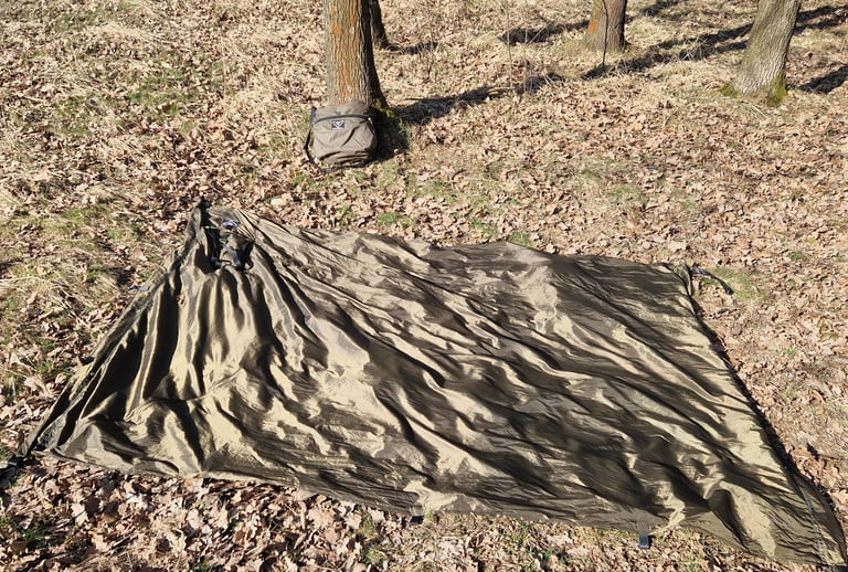 Rozłóż konstrukcję na ziemi. Zaczep oczka znajdujące się na krawędziach konstrukcji o stabilne punkty, takie jak hamak, drzewa, gałęzie lub sznury. W razie potrzeby wyciągnij pas z tunelu i wykorzystaj go do zaczepienia dwóch przeciwległych krawędzi konstrukcji o drzewa.