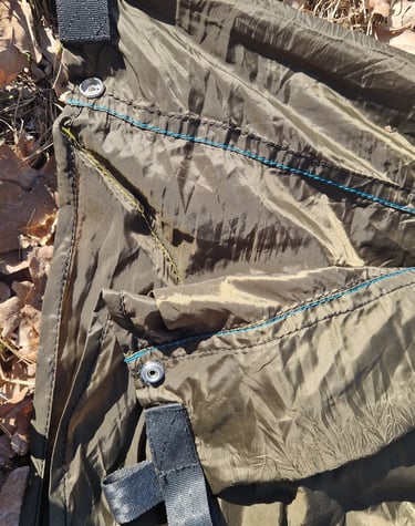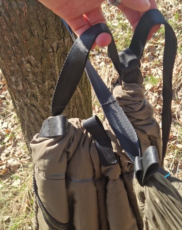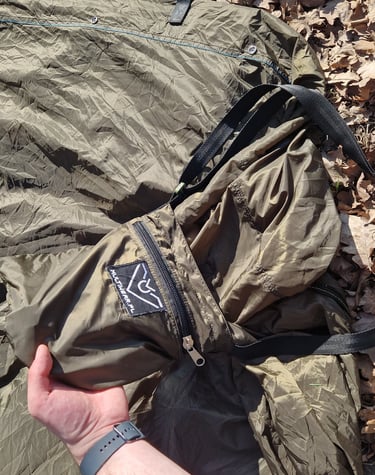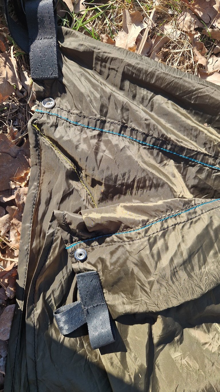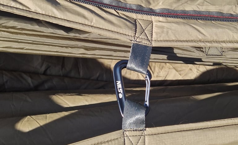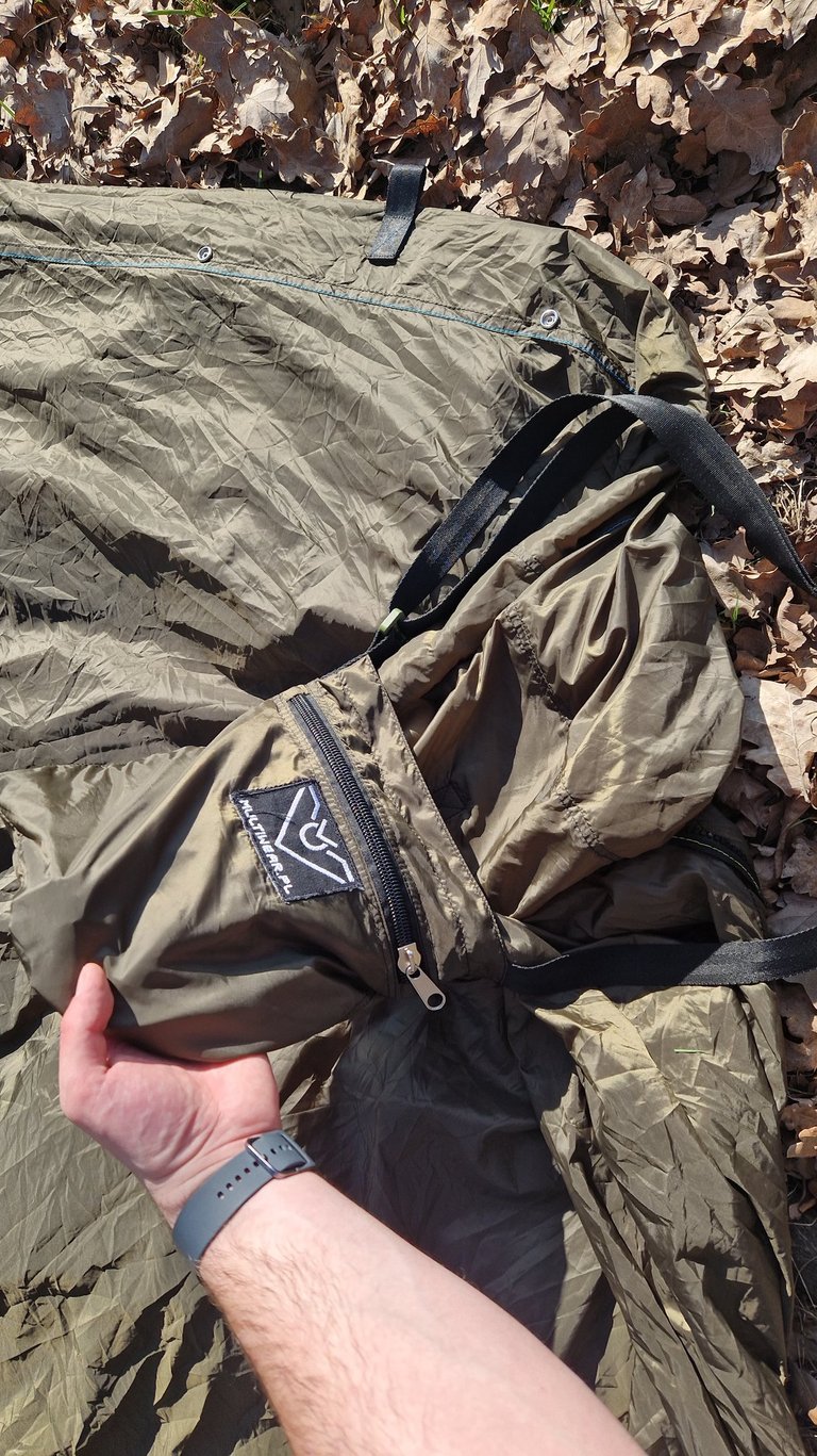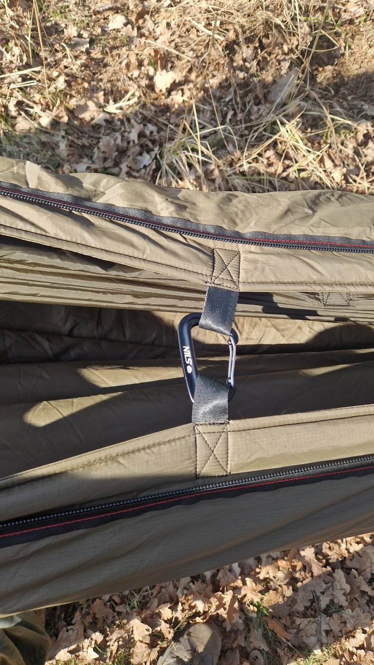 Rozłóż konstrukcję na ziemi. Złap za luźny pasek wychodzący z tunelu i przewlecz go przez oczko wychodzące z drugiej strony tego samego tunelu, tak aby zacieśnił się on na wiszącym pasie hamaka. Następnie zapnij pas o karabińczyk wiszącego hamaka. Powtórz czynność po drugiej stronie konstrukcji. Pozostałymi karabińczykami zepnij oczka dłuższych krawędzi tak, aby podpinka opatuliła hamak.