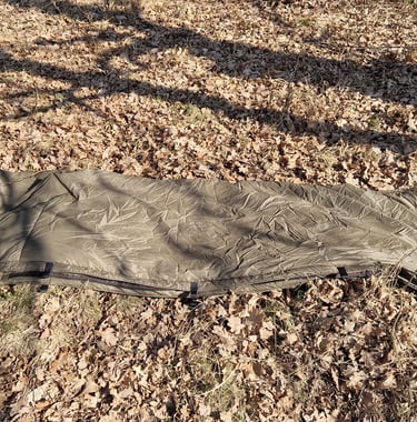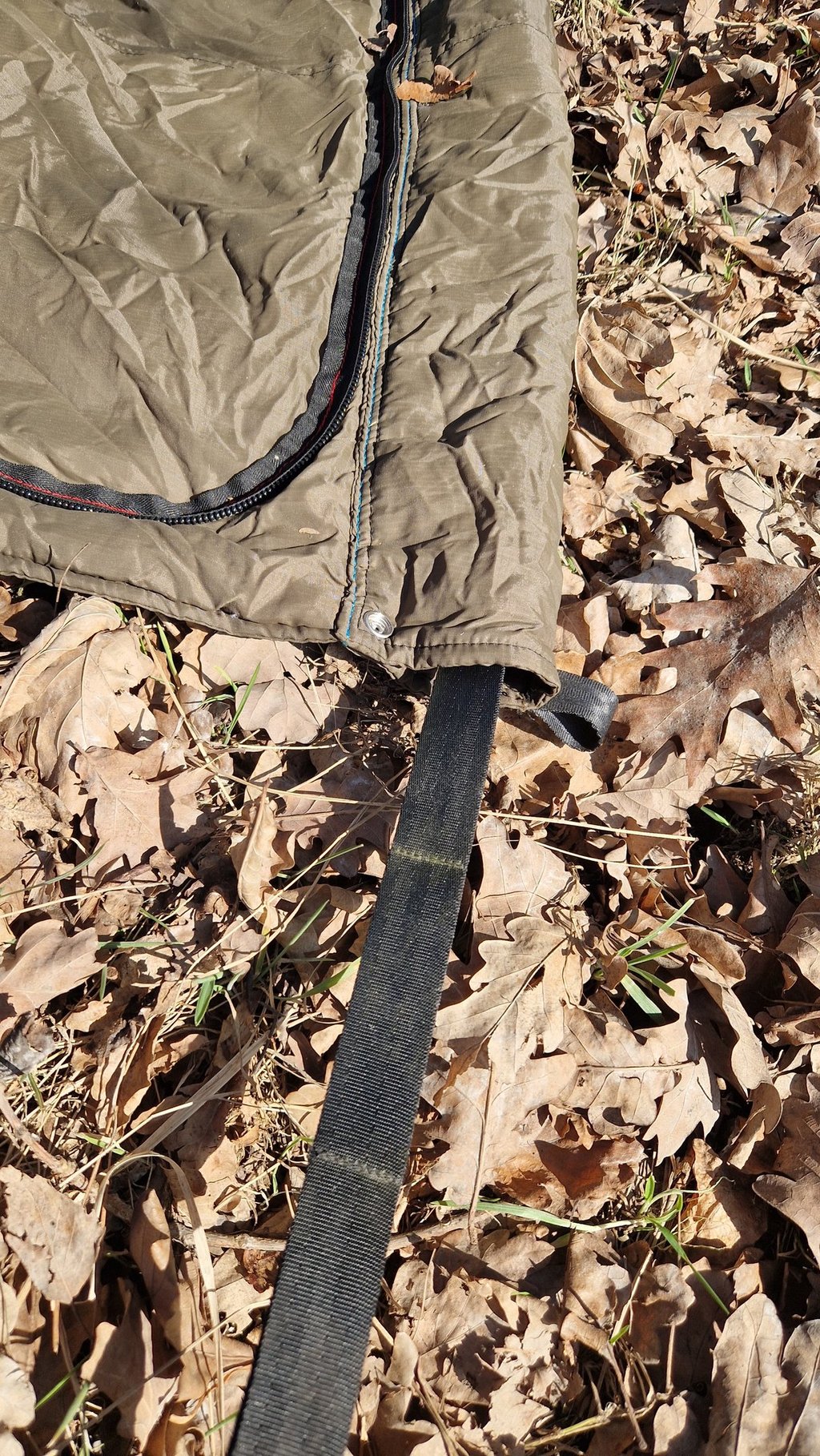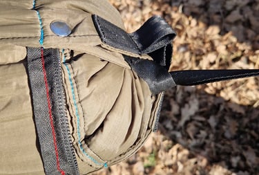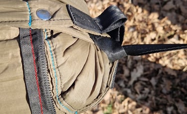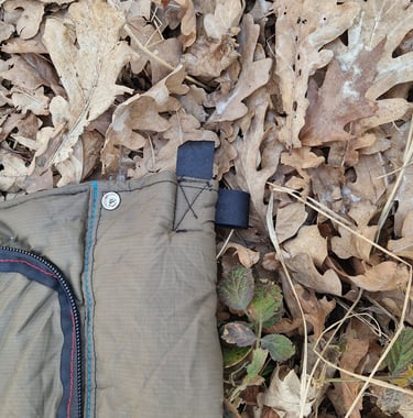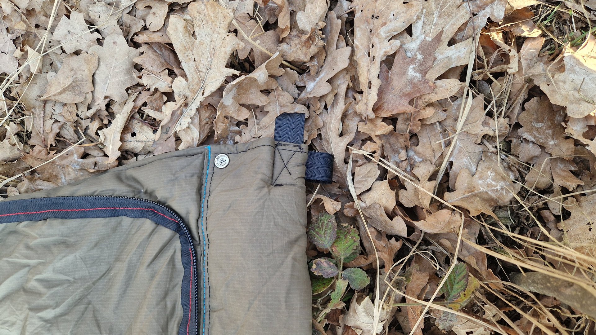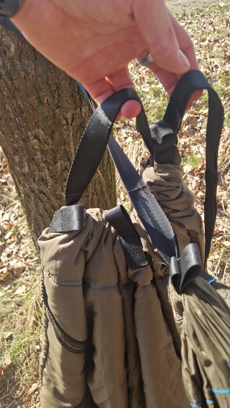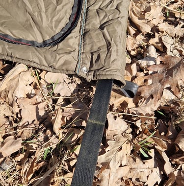 Rozłóż konstrukcję na ziemi. Złap za luźny pasek wychodzący z tunelu i przewlecz go przez oczko wychodzące z drugiej strony tego samego tunelu, tak aby zacieśnił się on na wiszącym pasie hamaka. Następnie zapnij pas o karabińczyk wiszącego hamaka. Powtórz czynność po drugiej stronie konstrukcji. Pozostałymi karabińczykami zepnij oczka dłuższych krawędzi tak, aby podpinka opatuliła hamak.
