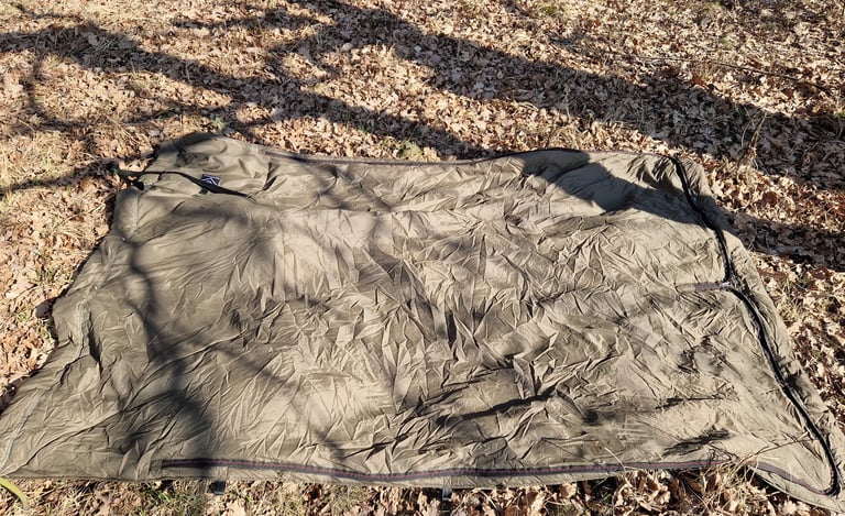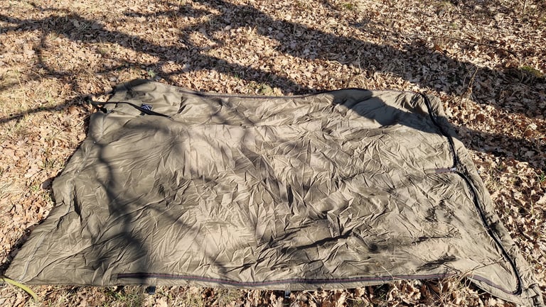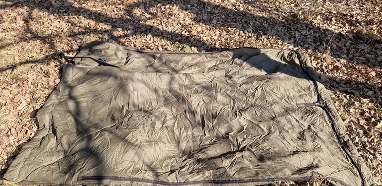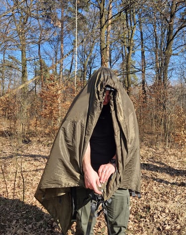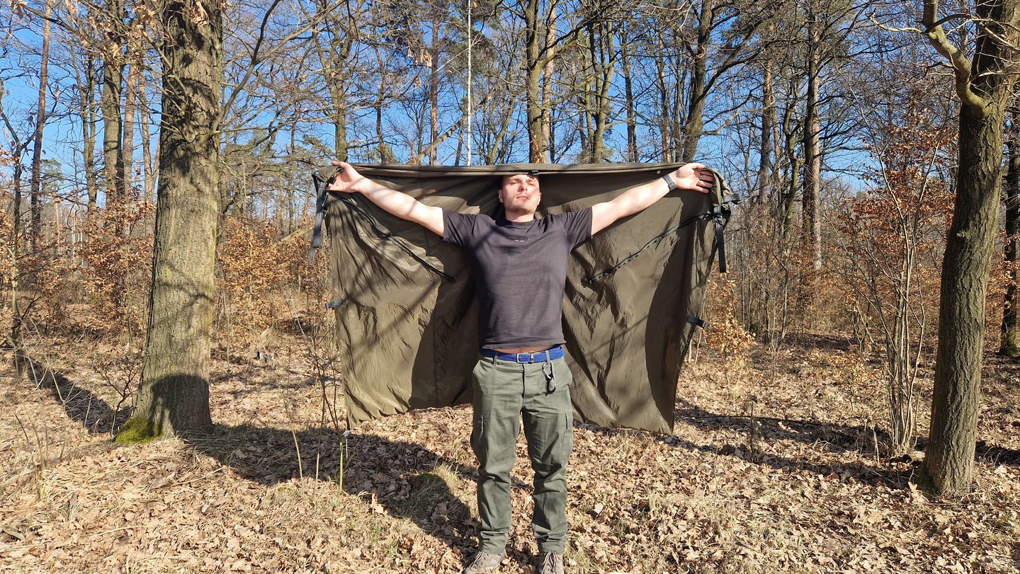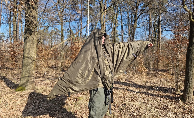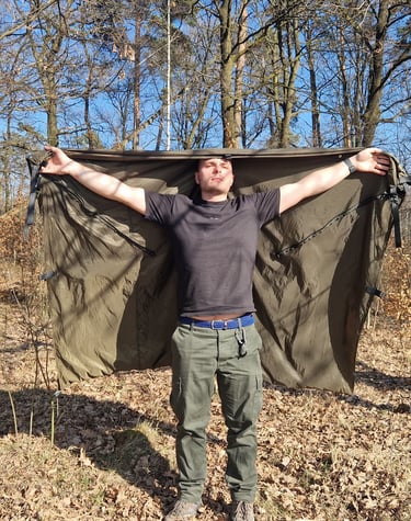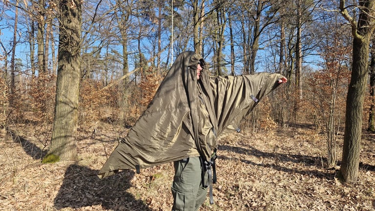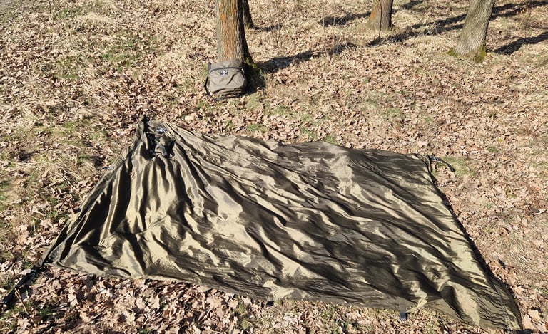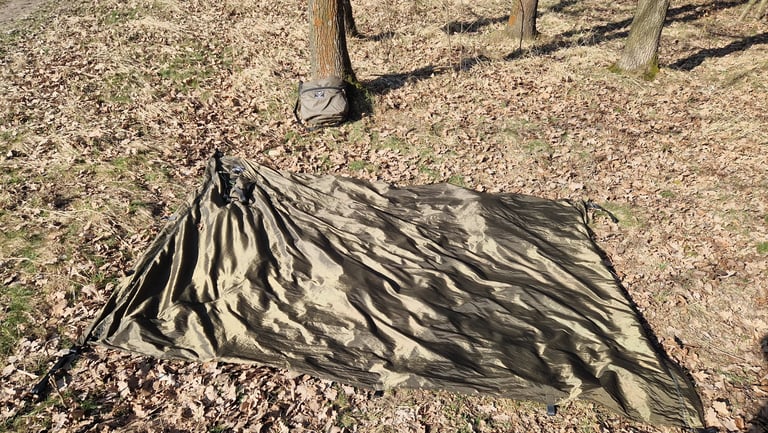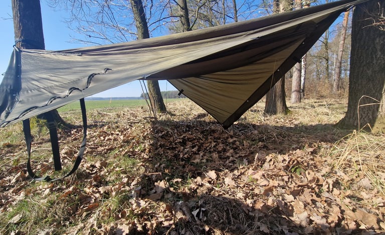 Rozłóż konstrukcję na ziemi. Zaczep oczka znajdujące się na krawędziach konstrukcji o stabilne punkty, takie jak hamak, drzewa, gałęzie lub sznury. W razie potrzeby wyciągnij pas z tunelu i wykorzystaj go do zaczepienia dwóch przeciwległych krawędzi konstrukcji o drzewa.