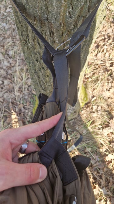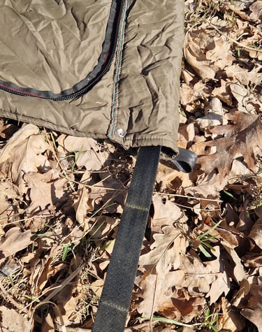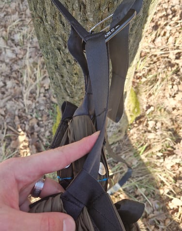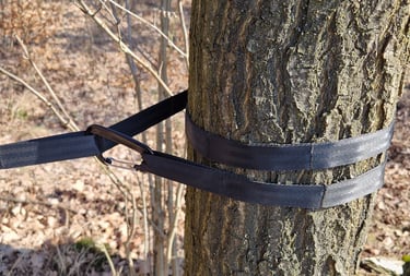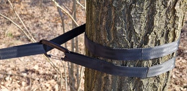 Rozłóż konstrukcję na ziemi. Złap za luźny pasek wychodzący z tunelu i przewlecz go przez oczko wychodzące z drugiej strony tego samego tunelu. Zaciągnij pasek, a następnie zapnij pas, owijając go dwa razy wokół pnia. Powtórz czynność po drugiej stronie konstrukcji.