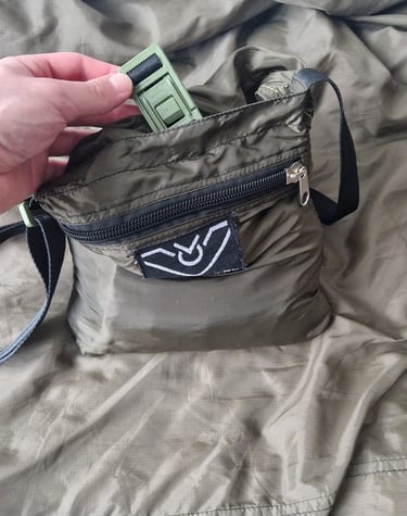 Rozłóż konstrukcję na ziemi. Odwróć kieszeń na lewą stronę i włóż do niej całą konstrukcję. Zapnij plastikowy klips, aby zabezpieczyć materiał przed wypadnięciem.